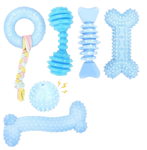 chew toys cause they keep his teeth clean. he dont have the bouncy ball no more cause it fell off the balcony.
