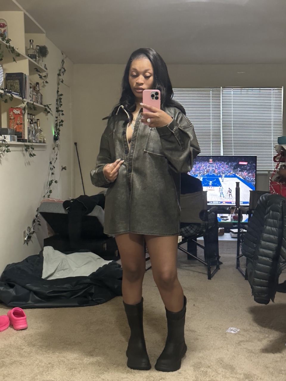 I wore this to Mariah the Scientist concert. This is the washed brown faux leather oversized shirt i bought in a size 10. Im usually a 6/8, it's from prettylittlething (sold out now). it's not even brown, this was like an army/dodo green.