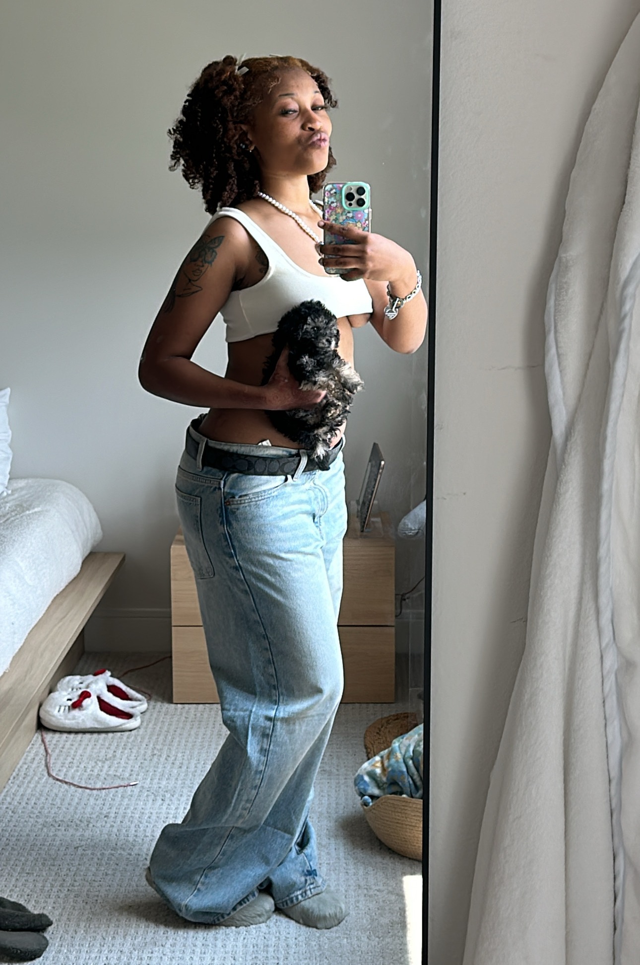 I wore this to go shopping. The top is from revice denim (kyoto crop in medium). it took months to come, i thought they was gon scam me. the pants from zara (relaxed mid waist TRF jeans). they sold out, but zara jeans is sum special. they fit so nice.
