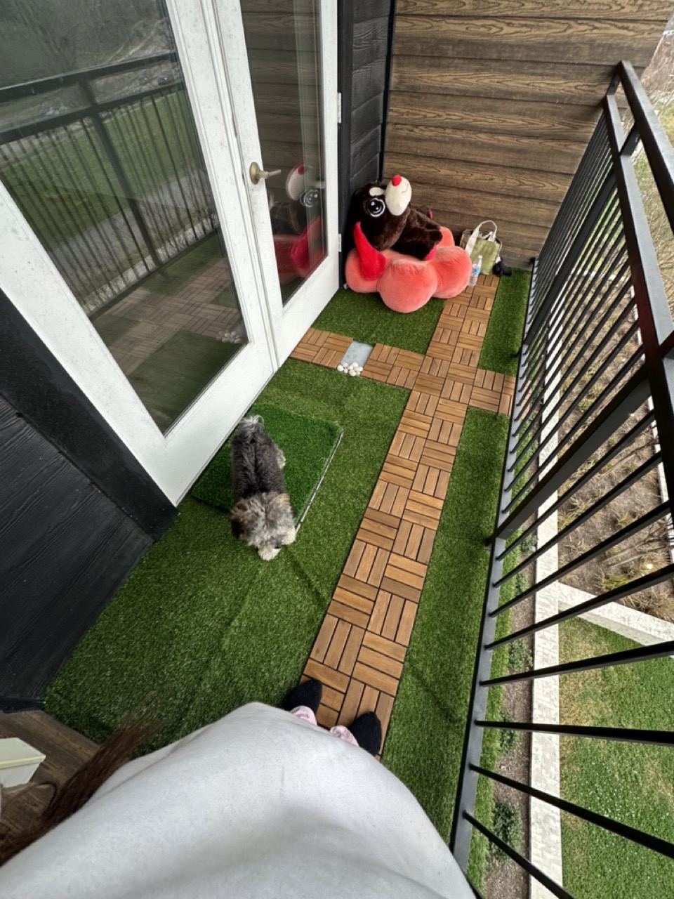 account for the Ikea tiles. While that was otw to me, I went to Ikea.com to buy the Runnen Outdoor tiles in the color Acacia (2 packs). I picked em up, they was kinda heavy, but yo girl b working out so I wasn't struggling fr. They was the first things I placed out there and the easiest. When my turf finally came I measured the empty spaces made from the tiles then cut them up accordingly. That took like 2 hours...maybe I need new scissors maybe the turf shouldn't had been so tough. I laid that girl out and added my rocks.